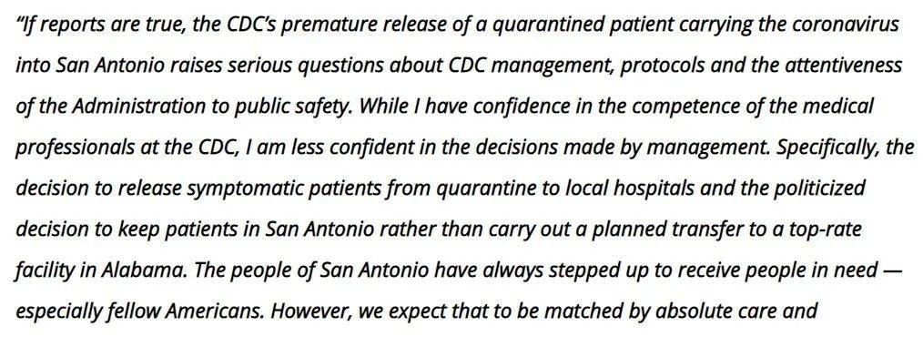 他认为,疾病预防控制中心过早误放了一名携带冠状病毒进入圣安东尼奥的隔离患者,