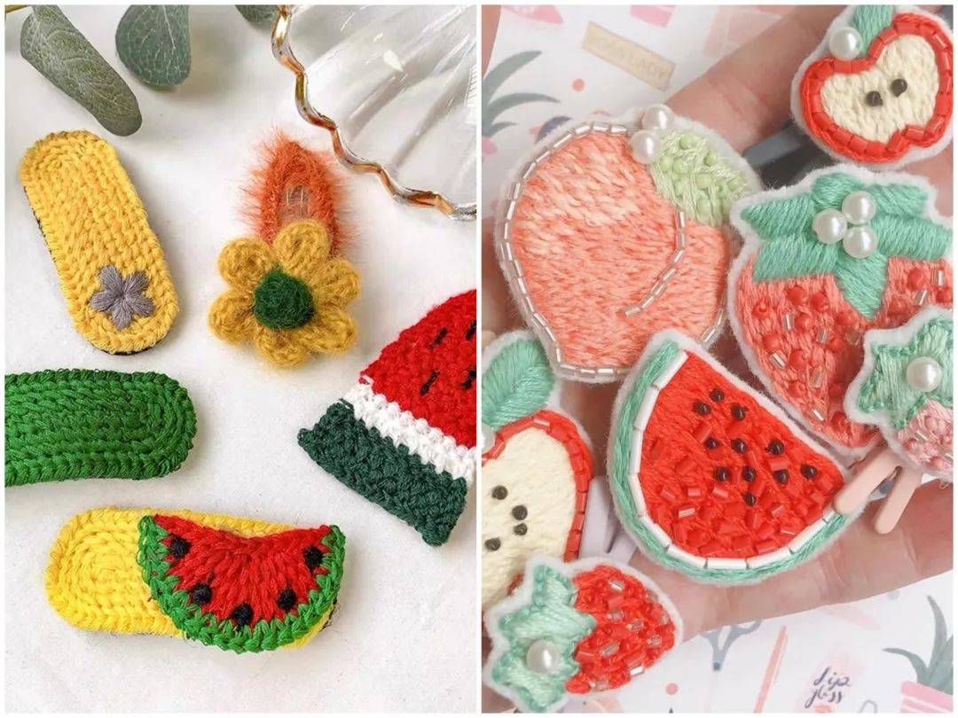 也有很多动植物果蔬类的图案也会用到编织工艺,就算不夹在头发上,也可以拿在手上把玩半天。