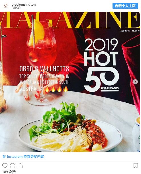 前MasterChef选手Andre Ursini主勺的Orso餐厅,荣登南澳州最热门餐厅榜首。