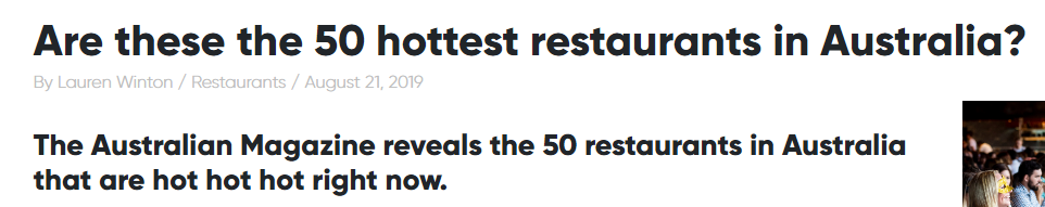该榜单由The Australian杂志专属美食评论家John Lethlean 主编发布,共评选出澳洲当地在过去18个月内开业的50家最热门餐厅(The List – Hot 50 Restaurants)。