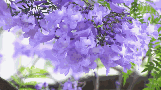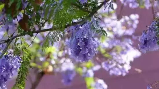 蓝花楹春季开花,一直开到初夏,花期长达两个月,但其最美最繁盛的时候大约只有三周,蓝花楹树形枝叶皆婆娑雅致,远观枝叶繁茂,近看妙曼多姿。