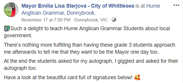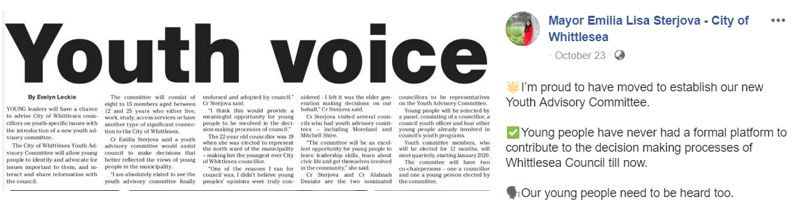 今年10月,斯特乔娃成立了新的青年咨询委员会,并在脸书上发声:“我们的年轻人也需要被倾听。” 她希望年轻人也可以有一个正式的平台来为Whittlesea委员会的决策过程做出贡献。