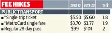 根据州预算文件,自7月7日起,公共交通服务费上涨2%,单程票价格上涨0.10澳元,至5.60澳元,刷卡单程票价格上涨0.07澳元,至3.77澳元。普通28天通行票价格上涨2澳元,至101澳元。两段式车票(Two-section fares)服务将被取消。