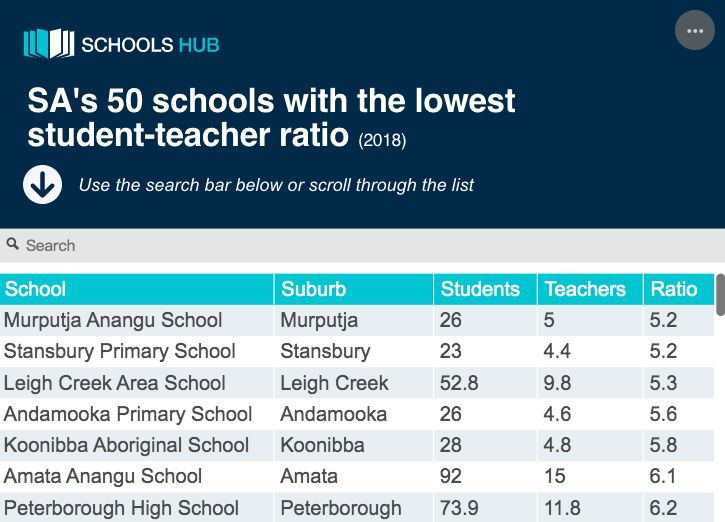 在公立小学中,Hawthorndene、Bridgewater、Ridgehaven、Lobethal、Craigburn、Nairne、Parkside、Grange和Flagstaff Hill这些学校每名全职教师分到的学生人数最多,为20人。