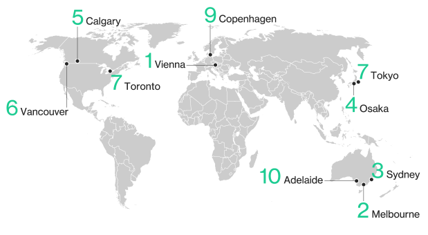 在本次最宜居城市的前十榜单中,有将近三分之一都是澳洲的城市。
