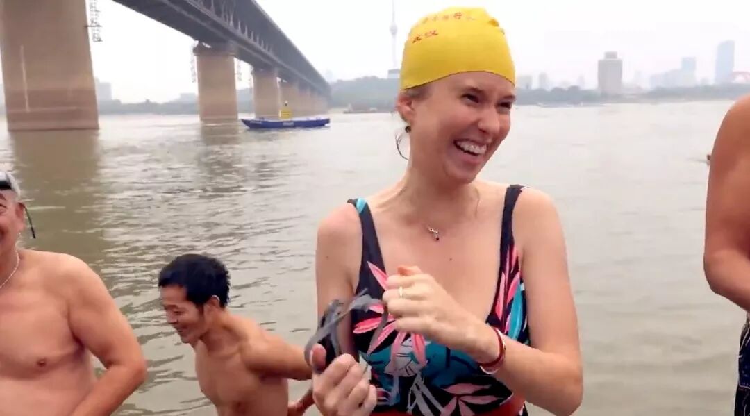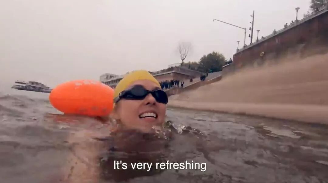 刚下水,也许是因为第一次尝试这种事,Amy 也是相当兴奋,边自拍边大喊:“我在长江大桥底下游泳,这太酷了! ”