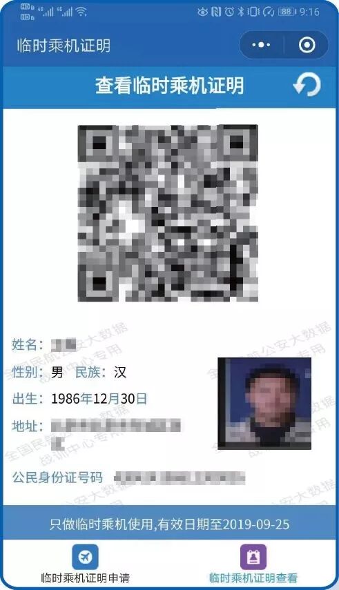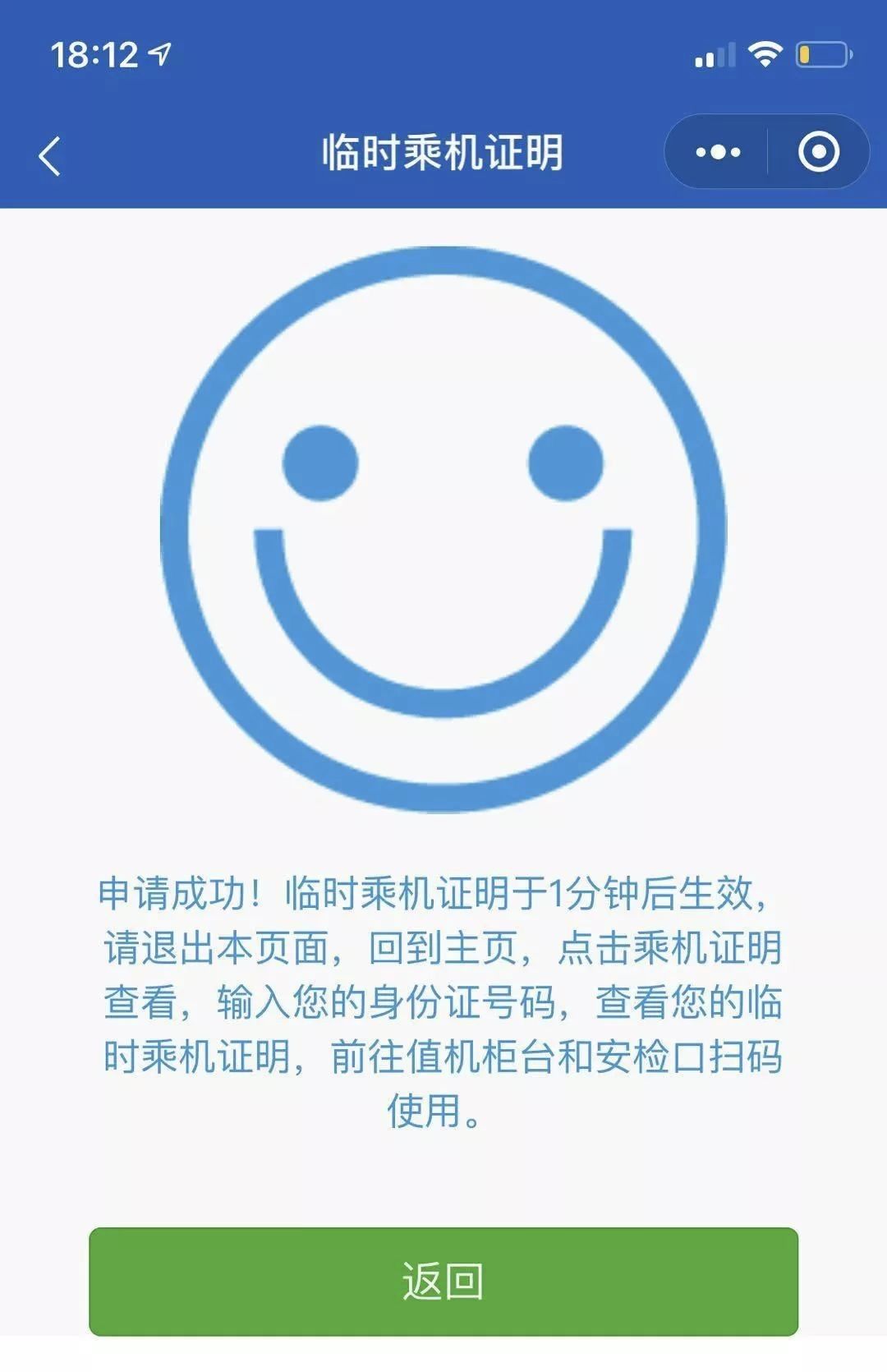 成功提交后60秒就能查询临时乘机证明,获得电子防伪二维码。