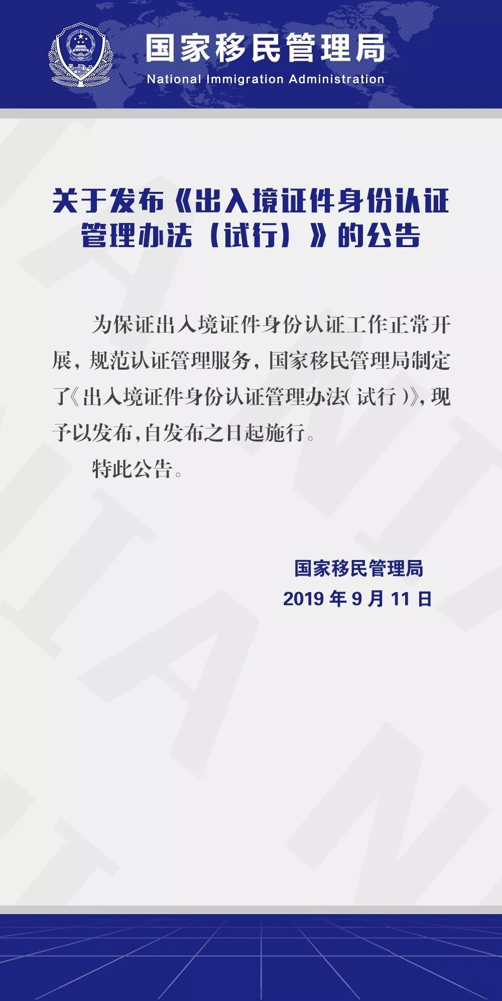 9月11日,国家移民管理局对外发布了《出入境证件身份认证管理办法(试行)》,并以公告形式对外发布。