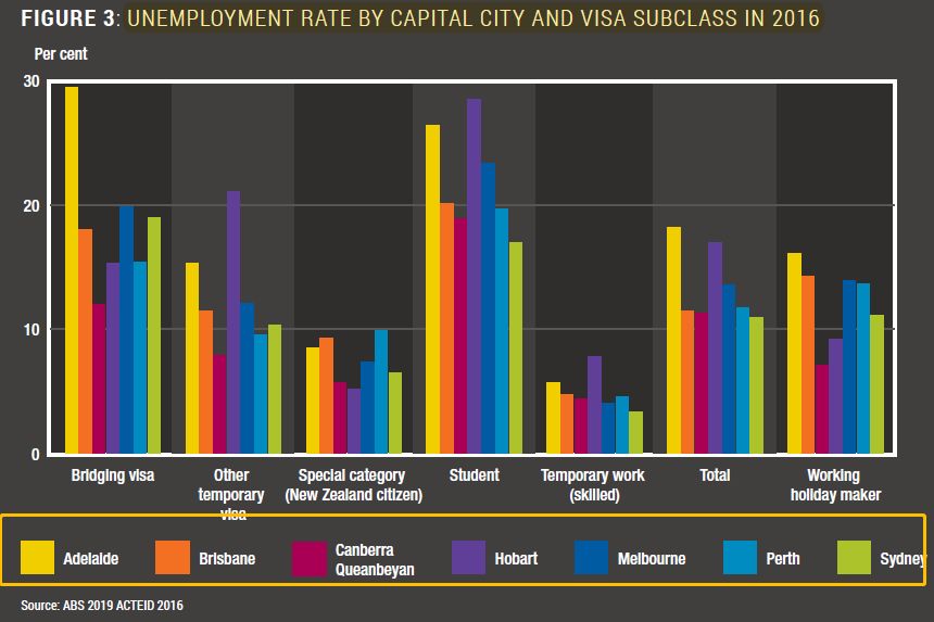 根据ABS 2016年的统计数据,临时签证在各个首府城市的“难点”都还不一样。如果持有过桥签证,在阿德莱德最难找工作,失业率高达30%;如果持有学生签证,在霍巴特和阿德莱德找工都有够呛的;如果是雇主担保,失业率相对就低很多。