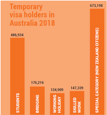 这份报告所说的临时移民主要包括雇主担保人群(457/482)、留学生、打工度假签持有者和新西兰公民,这四类人群都是可以合法在澳洲工作且过去16个月中可以或者在澳洲待满至少12个月。