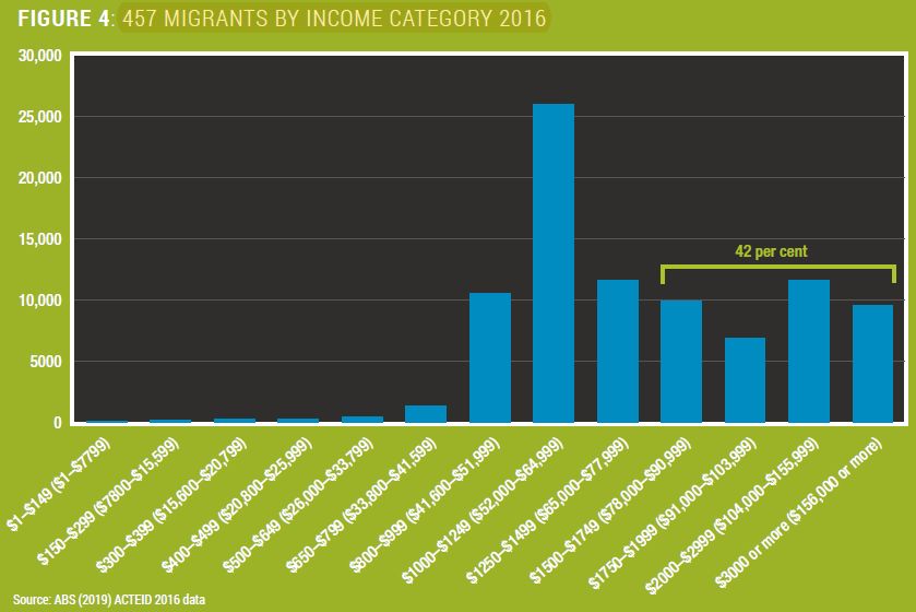 CEDA发现雇主担保签证持有者的失业率比PR和全澳人口平均水平都要低,而且平均年收入更加高。从下图看可能会更加清晰,因为雇主担保的最低年薪水平是$53,900,所以绝大多数457签证持有者的年收入都在$52000-64999这个区间。高收入者也不少,2016年时就有42%的457人群年收入至少有$78000,PR人群有这个收入水平的比例是35%。