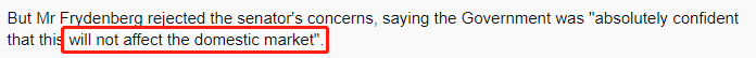 但Frydenberg表示,Jacqui Lambie的担忧是没有必要的,称此项收购“绝不会影响澳洲本地市场”。