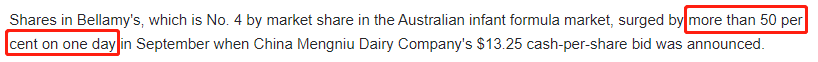 按市场份额计算,贝拉米在澳洲婴儿配方奶粉市场排名第四。Yahoo News称,在9月蒙牛宣布拟收购贝拉米那天,贝拉米当日的股价涨幅超过了50%。