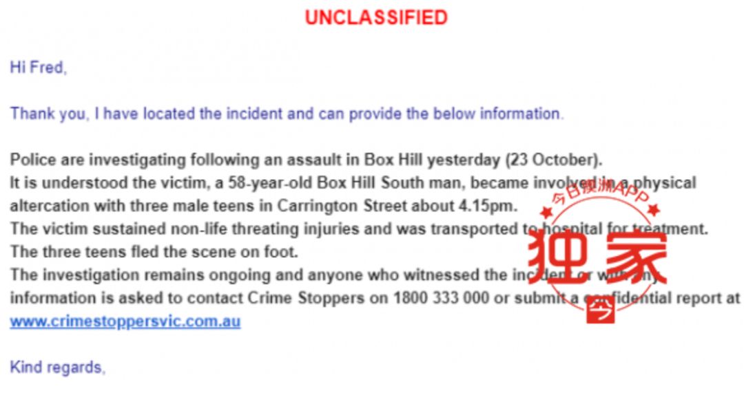 “维州警队正在调查10月23日发生于Box Hill的一起袭击事件。