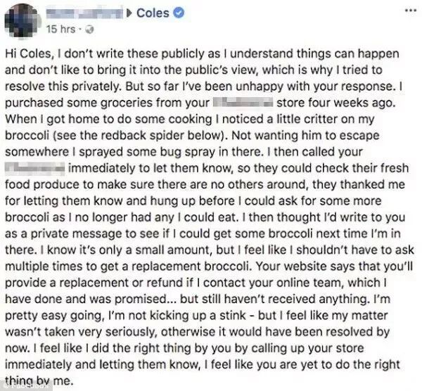 之后她用盒子装着西兰花和这只毒蜘蛛,回去找Coles讨要说法,