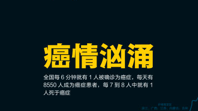 数据显示,2014年,全国恶性肿瘤发病例数为380.4万例,在中国,每天有8550人成为癌症患者,每6分钟就有1个人被确诊为癌症。