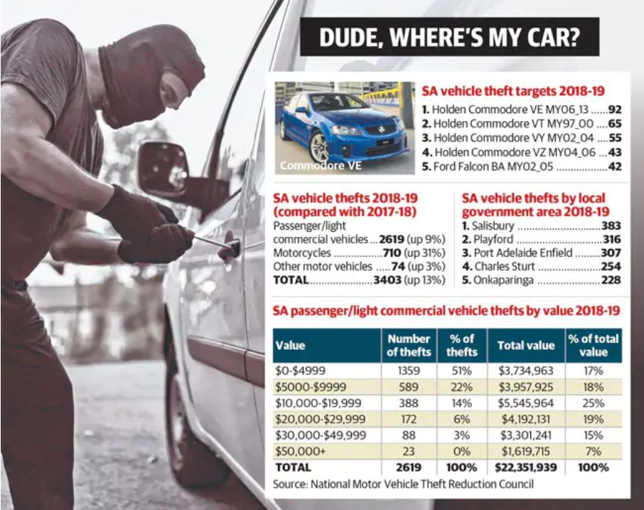 澳洲机动车防盗委员会的数据显示,在2018—2019年间,南澳共有3403辆机动车被盗,同比增长13%。在这其中,利益驱动的盗窃案增加了27%,短期盗窃(失窃后被追回)增加了8%,阿德莱德市议会地区盗窃案增加了59.8%,摩托车盗窃增加了31%。