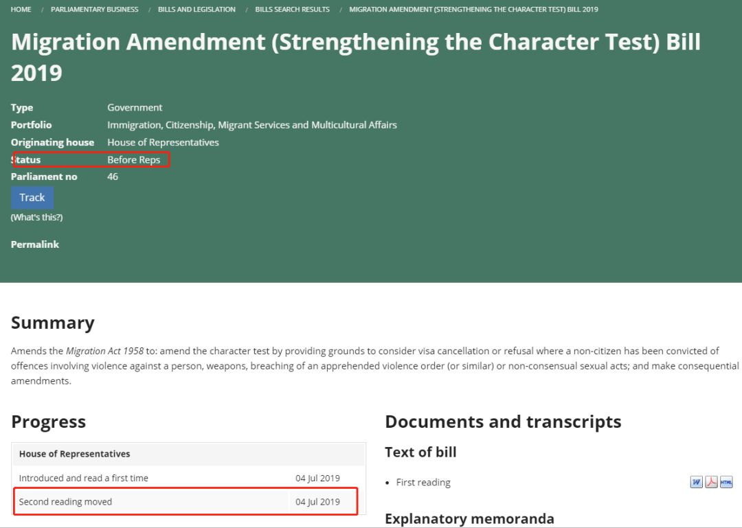 政府7月初推出了有关非澳洲公民因无法通过品格测试(“character test”)被取消签证的相关规定修改,这个bill目前Before House of Representatives的状态。