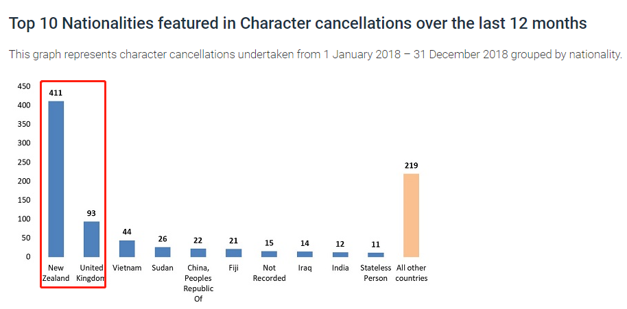 因为新西兰和澳洲的历史渊源,新西兰人在澳洲相对自由自在,因无法通过品格测试而被取消签证的人中,新西兰居首位。2016-18年间澳洲共驱逐了1023人回新西兰。其中还有不少没有入籍但从小生活在澳洲,他们基本上与新西兰毫无联系。