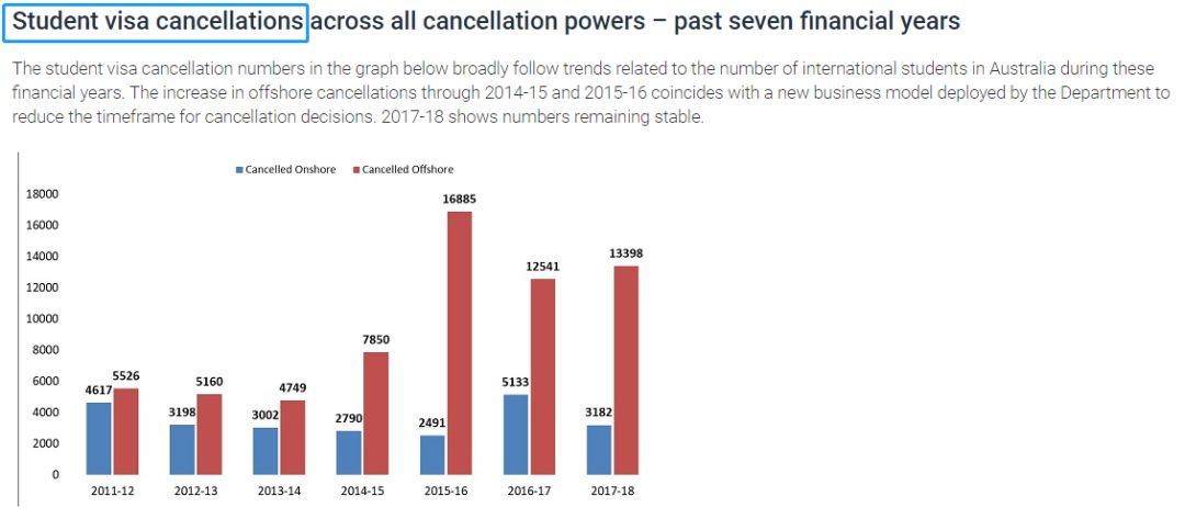 当然,大部分遵纪守法的我们应该都不会牵扯到品格测试。我们更应该注意的是,因为违反签证条款被取消签证,特别是学生签证。17-18年澳洲取消了超过3000个境内的学生签证,16-17更有超过5000个。
