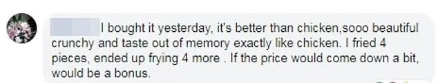 “我昨天买了一个,比真鸡肉还好!太脆了,而且味道跟记忆中的鸡肉味道一毛一样!本来只煎了4片,吃完忍不住又煎了4片。”