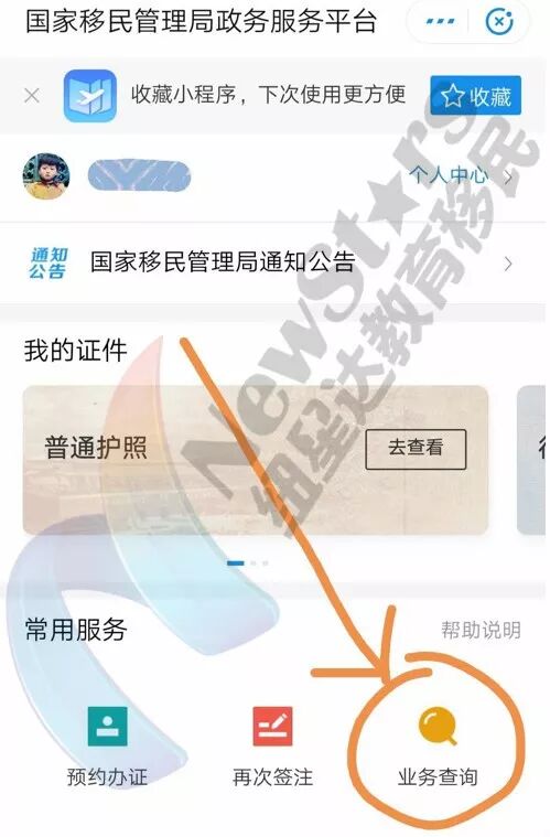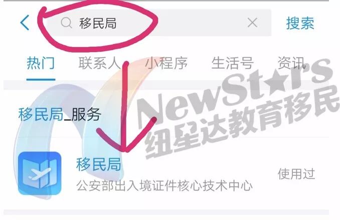 首先,在支付宝首页的搜索框中输入“移民局”,然后就会出现移民局的小程序,如下图: