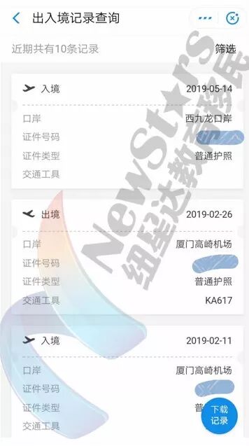右下角还会有一个“下载记录”的按钮,点击之后,就可以将出入境记录下载为一个非常正式的pdf文档。