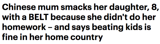 一位中国母亲用皮带打了她的女儿,她认为这样做没问题,因为在她的祖国这样做不会受到惩罚。