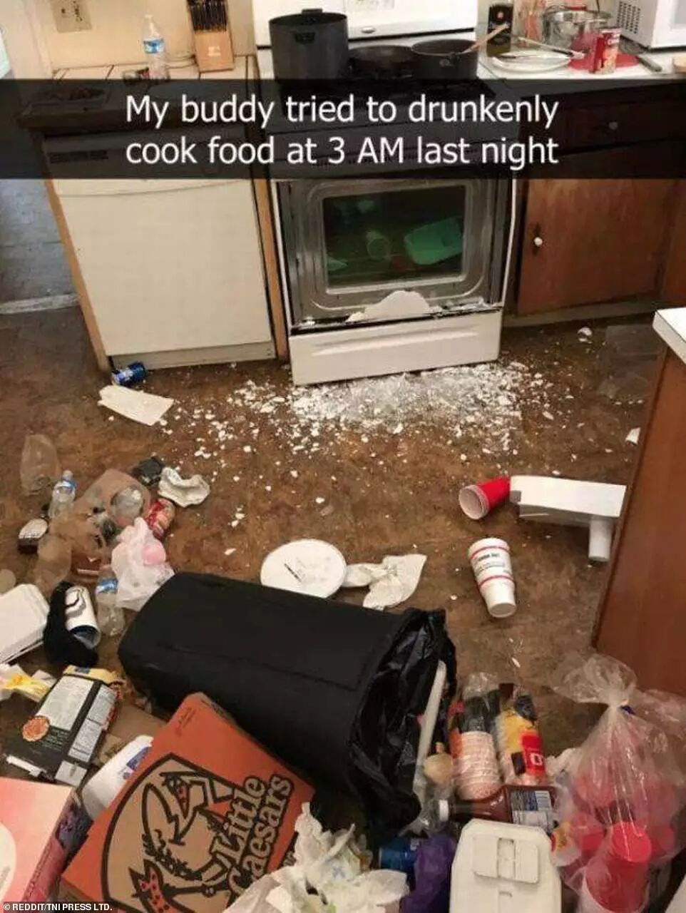 这张图片记录下了室友是如何企图在醉酒后使用烤箱,没有烧毁房屋已是万幸了!