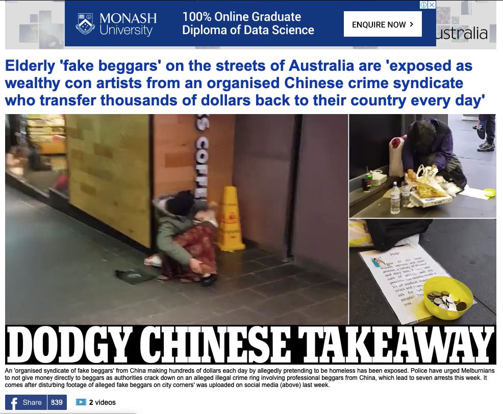 上个月,土澳两大新闻网站——《每日邮报》(Daily Mail Australia)和澳大利亚新闻网(news.com.au)强强联手,在社交媒体上发布了一段令人心头一颤的视频,标题为“城市角落里有组织的亚洲假乞丐团伙”。