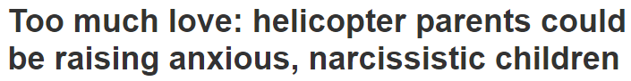据悉,虽然直升机式育儿方式在学龄儿童中的兴起已经有一些年头了,但最近冒出的一个新鲜话题则引起了广泛的重视——父母对年轻却已成年的子女会依然采取“直升机式”做法。