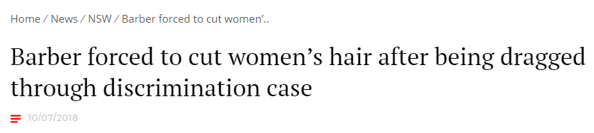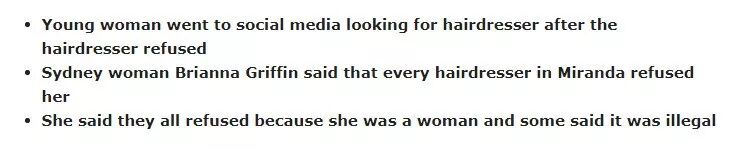 同样发生在悉尼,2018年7月,曾有报道称,一名理发师拒绝为一个小女孩理发,然后被客户投诉其违反“性别歧视法”。