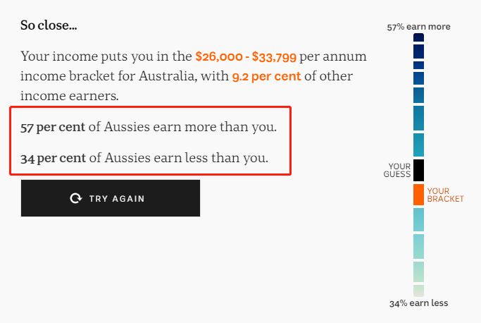 例如一周500澳元,年收入处于26000-33799这个区间,这个区间的人数占总数的9.2%。澳洲有57%的人收入高于你所处的区间,有34%的人收入低于。