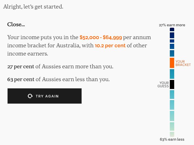 再例如说每周1000澳元,年收入就是处于52000-64999这个区间,代表了总人数中的10.2%的人。澳洲有27%的人收入高于你所处的区间,有63%的人收入低于。