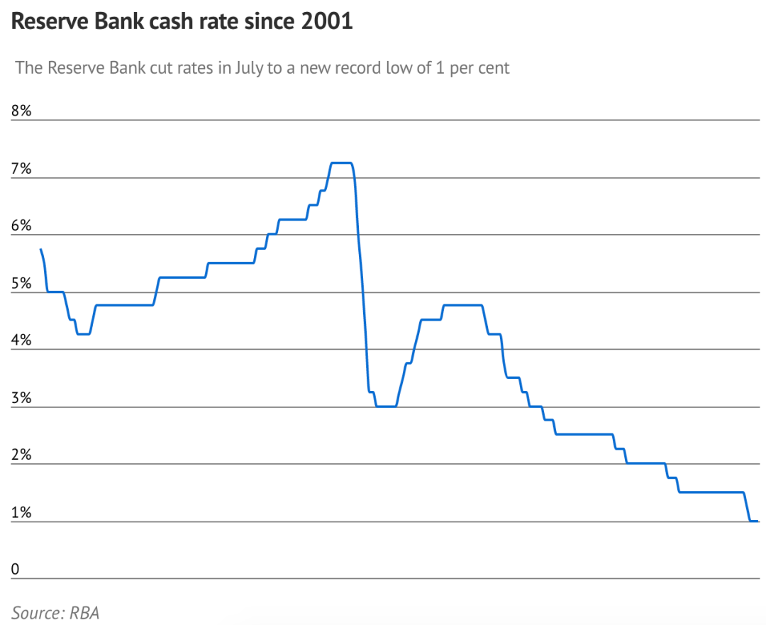 之后不到1个月,澳央行再一次将利率下调至1%,
