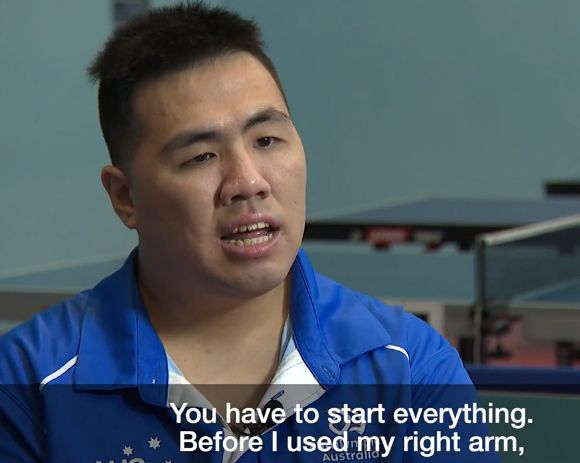 他拿起了英语书,开始学习英语,他走进了乒乓球室,开始自己的康复训练。