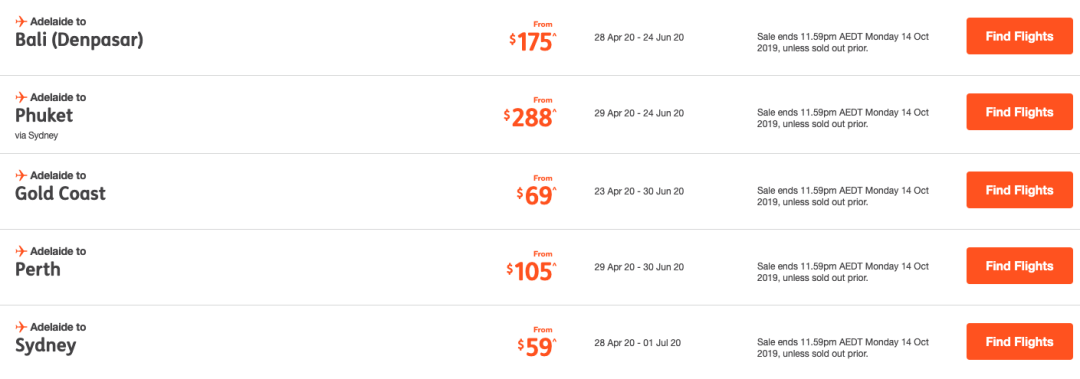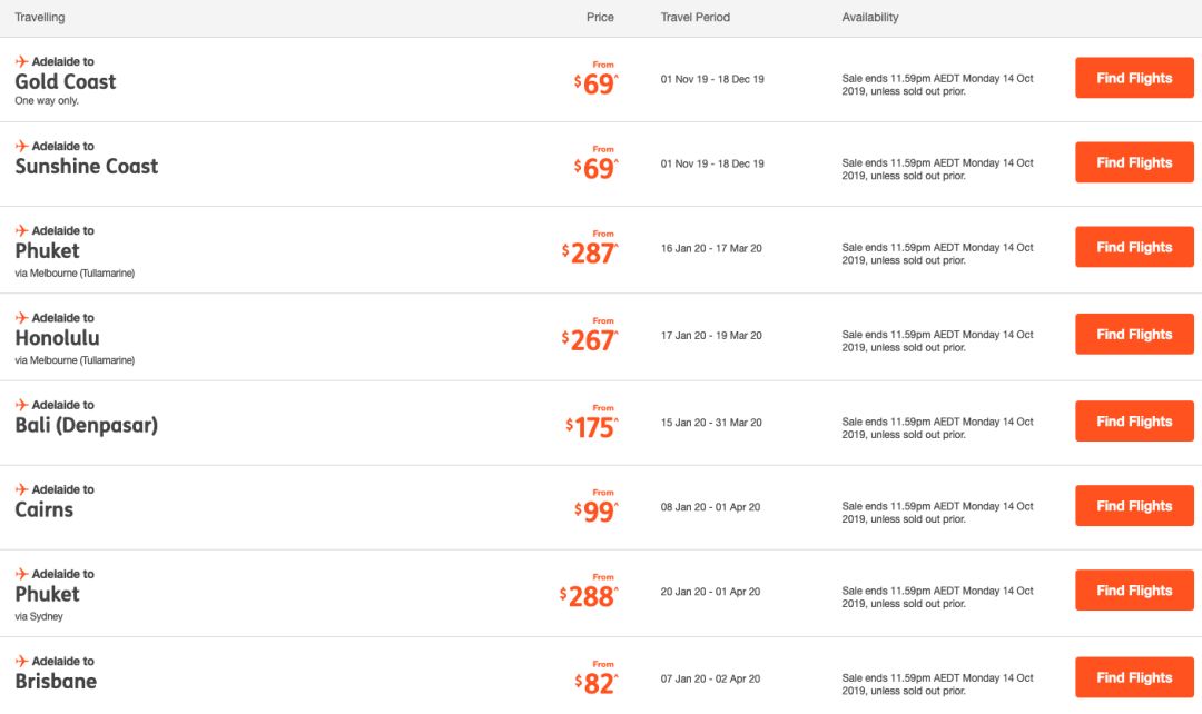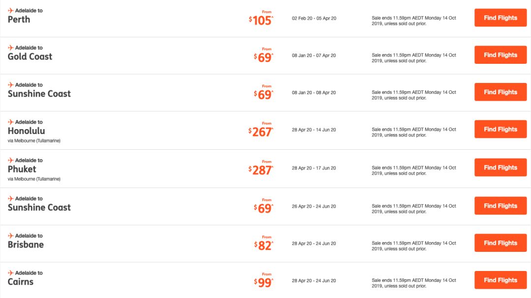 阿德莱德到黄金海岸 $69起