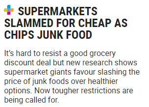 澳洲一项研究显示,超市的垃圾食品更倾向于成为打折商品,不健康的商品打折幅度更大。例如,巧克力、薯条和含糖谷类食品经常打折。