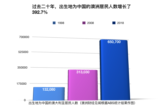据ABS统计,在2018年,出生地为中国的澳洲居民共有约65万人,比1998年增长了392.7%。