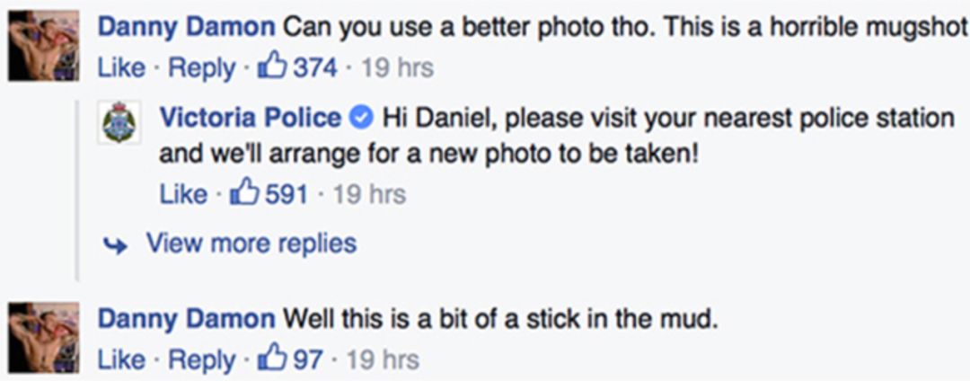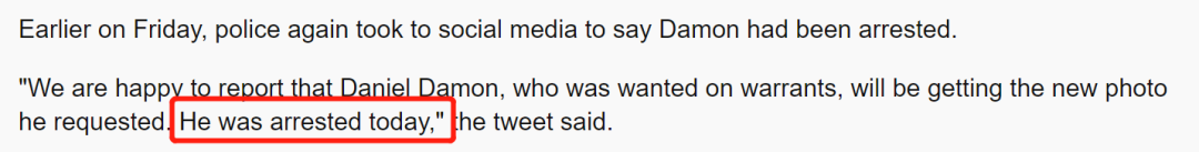 “我们很高兴地宣布,之前被我们通缉的Daniel Damon,终于可以如愿以偿地换张照片了!因为他今天被捕了!”