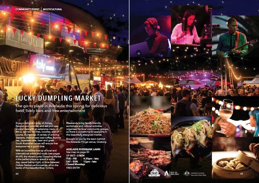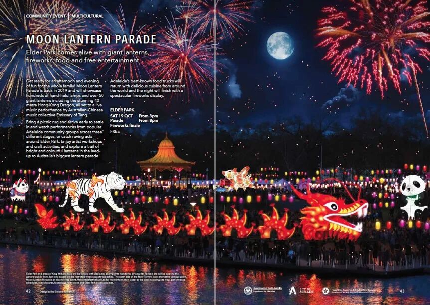 和去年一样,今年的澳亚艺术节仍然有呼应中国中秋节的花灯大游行活动。10月19日在Elder Park,50个巨型花灯,40米舞龙,还有一系列大唐主题的音乐表演,完美还原了一个中国传统节日的独特氛围。入夜之后,还有大型烟花表演,如梦似幻。当然,美食也是必不可少的,来自世界各国的美食在现场都能品尝得到。