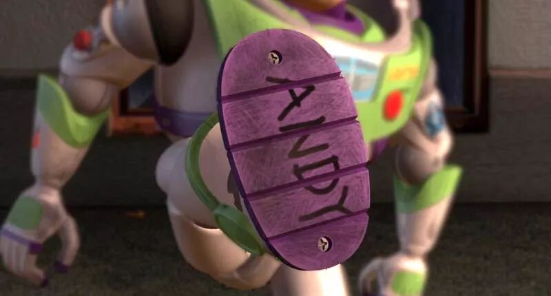 如果你仔细观察就能看到,巴斯光年标志性的太空服上设计了紫色和红色的纽扣,脚底还刻了ANDY的名字,就像在电影中一样~