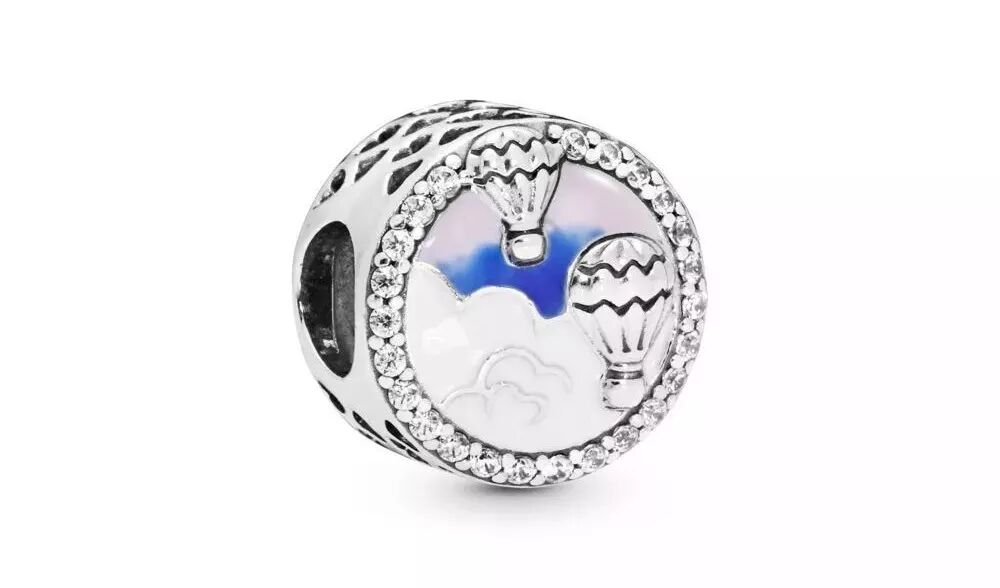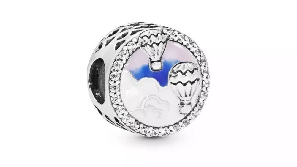 这枚镂空桃心的串珠可以为你的手腕造型锦上添花,飞翔的热气球,棉花一样的白云和柔美的夕阳形成一道梦幻风景,背面还有“Live life in the clouds.”字样。