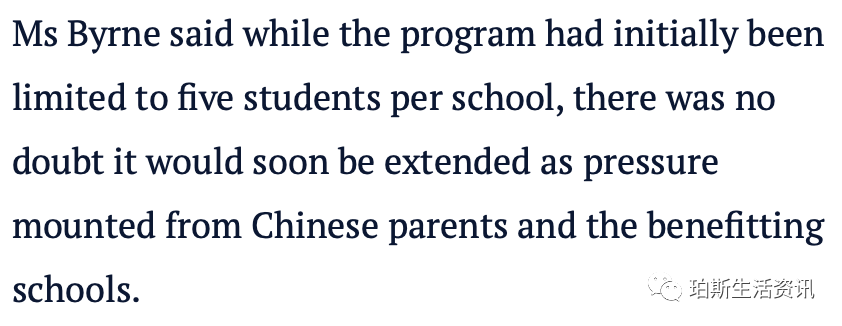 州立学校教师工会西澳州州长 Pat Byrne也说:“尽管这个计划仅限于每所学校五名学生,不过,随着来自中国父母和学校的压力增大大,该计划很快在其他学校也需要实施”