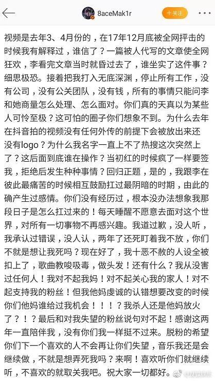 随后PGone发文承认与李小璐恋情,称视频是18年3、4月录制的。文中似乎还暗示有人(贾乃亮)从中作梗,这次是被人摆了一道?