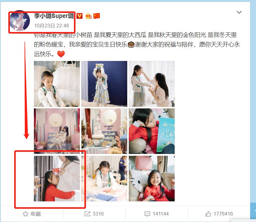 10月23日,李小璐的微博发了和女儿的合照,其中在第7张照片中可以看到:李小璐留着同款的水晶指甲!