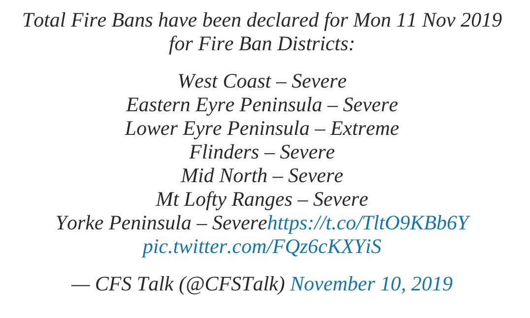危险的高温和大风天气已促使南澳州多个地区发出了“严重”火灾危险警告。已对West Coast、Eastern Eyre Peninsula、Flinders、Mid North、Mount Lofty Ranges、Yorke Peninsula这几个地区发出了警告,这些地区都实施了全面禁火令。