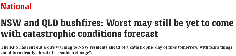 高温、强风和干燥的空气于今日共同造成澳大利亚历史上最危险的丛林火灾。The Hunter、the Illawarra、greater Sydney等地区都处于“灾难性”火灾危险警告之下——自从10年前新评级系统实施以来,悉尼首次面临这种威胁。
