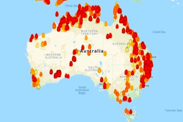 这张澳大利亚地图显示了席卷澳大利亚大部分地区的可怕大火的规模。