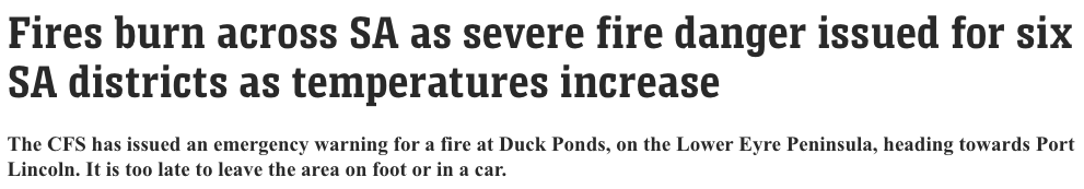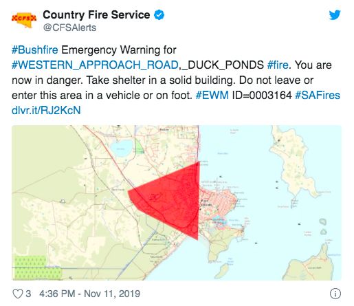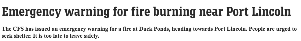 截至昨日傍晚,乡村消防局(CFS)已发出紧急警告,在往林肯港方向的Duck Ponds发生了丛林火灾。人们被迫寻求庇护。那时人们想要安全离开为时已晚。